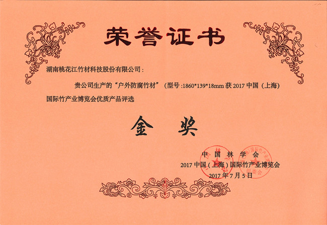 湖南桃花江竹材科技股份有限公司生產(chǎn)的戶外防腐竹地板在2017年7月中國(上海)國際竹產(chǎn)業(yè)博覽會中榮獲金獎,該獎項由中國林學(xué)會、中國(上海)國際竹產(chǎn)業(yè)博覽會頒發(fā)。湖南桃花江竹材科技作為中國竹材領(lǐng)域高炭防腐技術(shù)的發(fā)明人,在中國竹材領(lǐng)域有著舉足輕重的地位。湖南桃花江竹材科技一直專注與于竹材的戶外運用研發(fā)與創(chuàng)新,為全球客戶提供高品質(zhì)竹材。