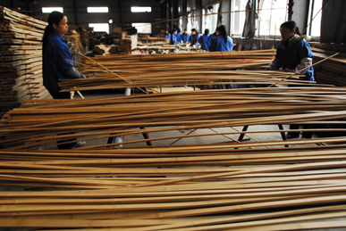 選色配片,主要是將色調(diào)均勻一致的竹片做嚴(yán)格的挑選處理,使得生產(chǎn)成的竹集成材具有一致的色調(diào),從而更加美觀。