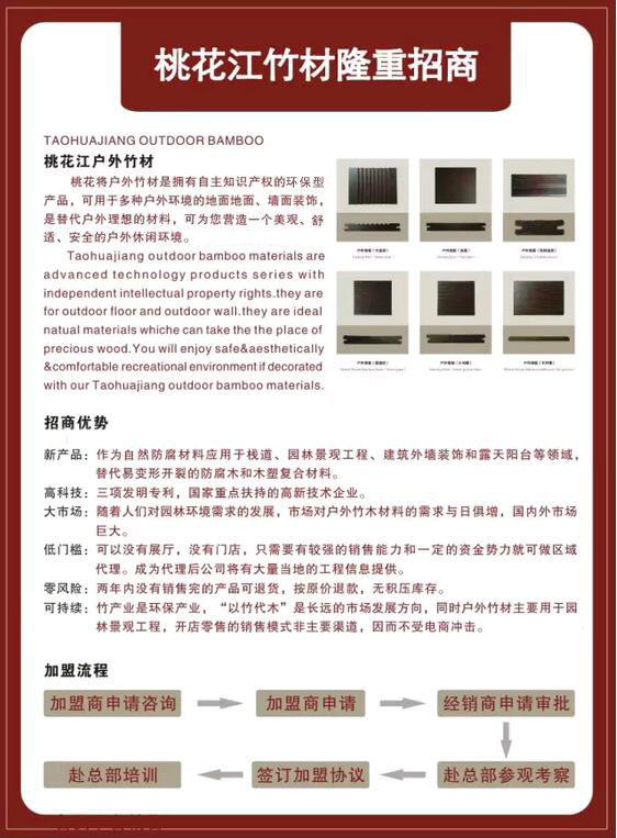 湖南桃花江竹材科技股份有限公司是湖南生產(chǎn)環(huán)保竹材的廠家,地處提名"楠竹之鄉(xiāng)"——湖南益陽(yáng)市桃江縣,竹子資源得天獨(dú)厚。公司成立于2001年7月,注冊(cè)資金5076萬(wàn),為湖南省農(nóng)業(yè)產(chǎn)業(yè)化龍頭企業(yè)和湖南省林業(yè)工業(yè)龍頭企業(yè),“桃花江”牌系列竹材為湖南竹材產(chǎn)品。公司為中國(guó)林重點(diǎn)龍頭企業(yè)和國(guó)家高新技術(shù)企業(yè)。公司通過(guò)了ISO9001:2008國(guó)際質(zhì)量體系認(rèn)證和ISO14001:2004環(huán)境管理體系認(rèn)證。